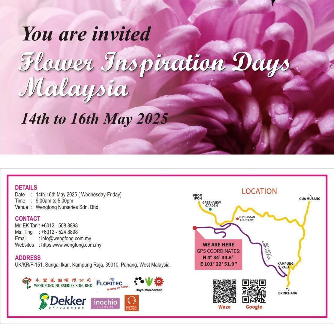 Date : 14th to 16th May, 2025 Opening : 9:00am to 5:00pm Venue : Wengfong Nurseries Sdn. Bhd.NavigationFor those who need details on the navigation, please click the link below to view respective method to navigate; Share this post on: Share on Facebook Tweet This Share on LinkedIn Share on Google+